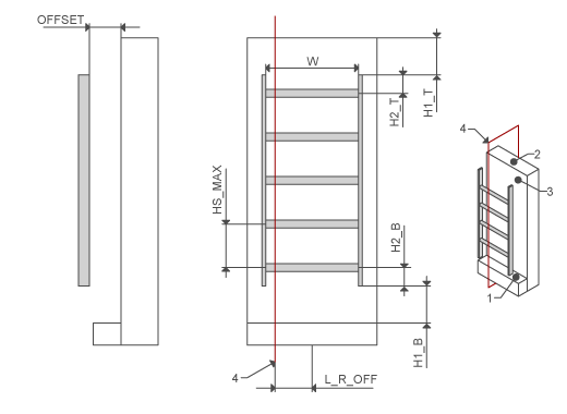 LADDER_1 | | Bottom plane Top plane Attachment plane Center plane | Top level tread Bottom level tread | L_R_OFF W HS_MAX H1_T H2_T H1_B H2_B OFFSET |