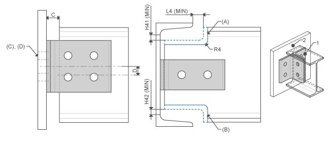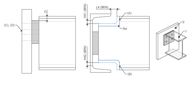 ENDPLATE IS | ![]() | I-Profile top Attach face | Top beam end cope Bottom beam end cope Attach holes thru all Attach holes thru next | D L4_MIN H41_MIN H42_MIN R4 |