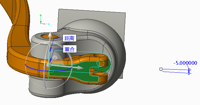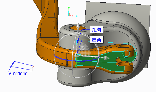 • 在图形窗口中,选择运动轴拖动控制滑块,右键单击,然后从快捷菜单中选取“反向连接”(Flip Connection)。