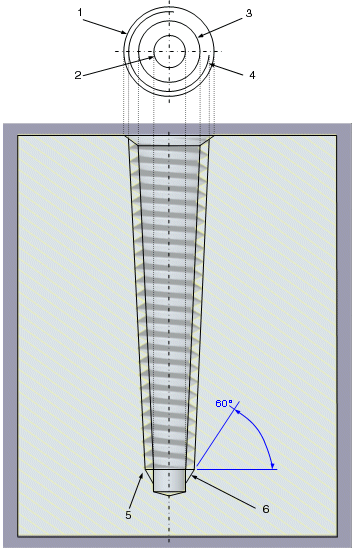 下图是叠加在细节模型上、显示为同心圆的锥形螺纹孔的简化表示: