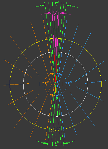 • 如果在 15 度区域以外选择放置点 (橙色和蓝色区域),系统将创建 175 度的尺寸,并根据尺寸的自动放置规则将其放置在选定点上。