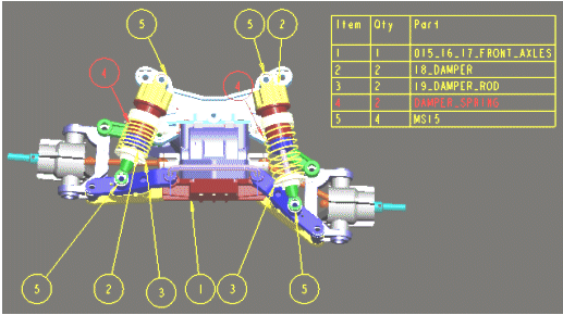 例如,下列装配包含两个被定义为挠性元件的弹簧 (DAMPER_SPRING),但两个弹簧的挠性值不同。重复区域的属性被设置为“无多重记录”(No Duplicate)。这两个弹簧在单个行内用同一索引号表示。但是,数量显示为两个。首次创建 BOM 球标时,会创建一个表示名称相同的挠性元件中所有实例的球标。但是,在第二次创建 BOM 球标时,名称相同的挠性元件的每个实例都会被分配一个具有相同索引号的球标。