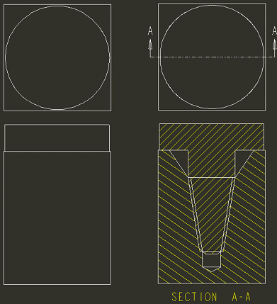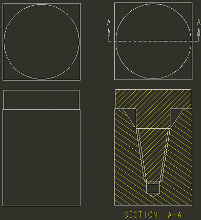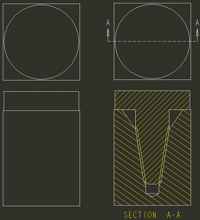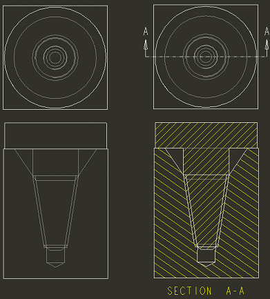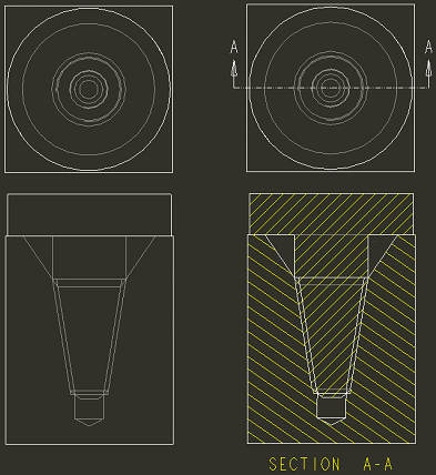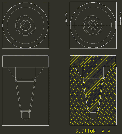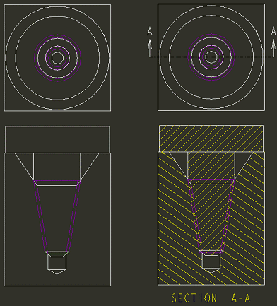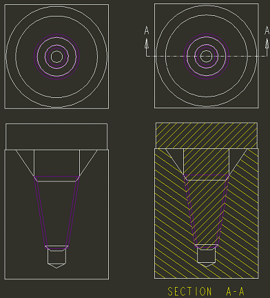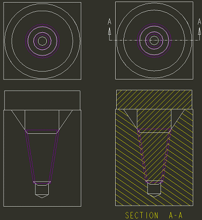 在“消隐”显示状态中,修饰螺纹面组不会显示出来。侧视图不显示孔或轴。顶视图和截面视图与隐藏线视图相同。隐藏线不会显示出来。 | |