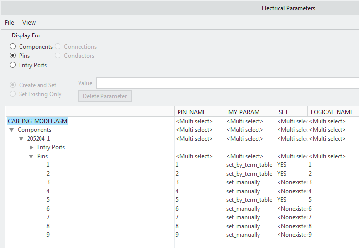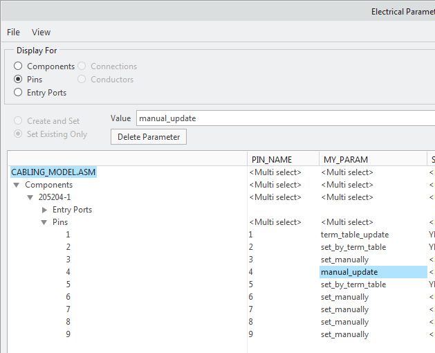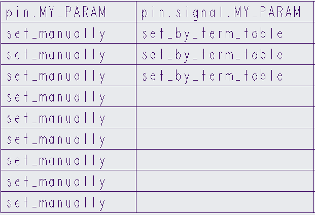 在“电气参数”(Electrical Parameters) 对话框中手动添加、由逻辑数据或通过执行终结器表手动创建的用户定义插针参数显示在“电气参数”(Electrical Parameters) 对话框中,该对话框位于分配给“插针”(Pins) 下用户定义的参数的单个列中。例如,在以下示例中,用户定义的插针参数 MY_PARAM 和值显示在“插针”(Pins) 下的 MY_PARAM 列中。
