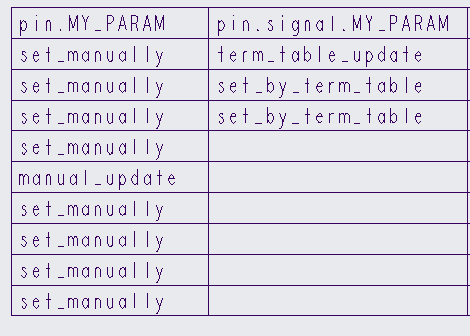 在上述示例中,由逻辑数据或通过执行终结器表创建的用户定义插针参数 MY_PARAM 显示在 pin.signal.MY_PARAM 中。手动创建的用户定义插针参数 MY_PARAM 显示在 pin.MY_PARAM 中。