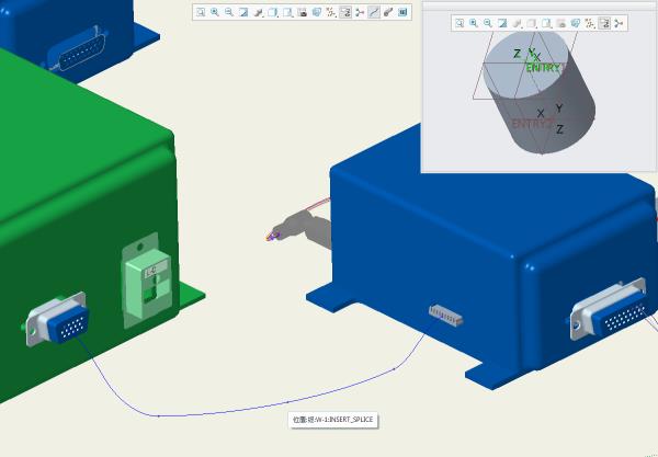 • 串联连接器 - 成对的凸凹连接器,将一条缆分割为两条物理缆,但仍保持两者之间信号的连续性。对于连接器装配,在表示入口点和引出点的一侧必须有装配级坐标系。当放置在现有缆上时,它将缆分割为两个独立命名的图元。每个图元的长度自入口或引出位置点开始计算。要添加内部长度,可以使用元件上的入口端参数 int_length。