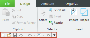 • “快速访问”(Quick Access) 工具栏 - 不管在功能区中选择了哪个选项卡,“快速访问”工具栏都可用。默认情况下,它位于 Creo Layout 功能区的下方。它便于用户快速访问常用命令,例如:打开、保存、撤消、重做、重新生成、关闭窗口和切换窗口。您可以自定义快速访问工具栏,使其包含功能区中的其他常用命令。