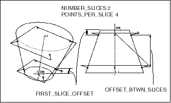 When you choose Automatic from the ADD POINTS menu, the system generates the first slice at FIRST_SLICE_OFFSET from the start plane in the direction that you have specified when defining geometric references. The number of Measured points in the slice is defined by the POINTS_PER_SLICE parameter (the default is 4). If NUMBER_SLICES is greater than 1, the system generates the rest of the slices at OFFSET_BTWN_SLICES distance from the previous slice.