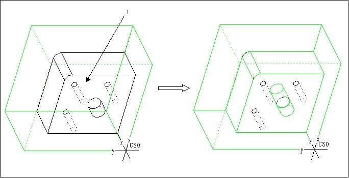 To machine the NC Model in this example, create a Step feature, and select the bottom of the cavity (1) as the Floor surface, as shown in the following illustration. Machining the Step feature leaves the material on top of the protruding boss.