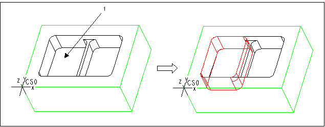 1. Create a Pocket feature and select the bottom of the cavity (1) on one side of the rib as the Floor surface. The system creates the Pocket feature, as shown in the following illustration.
