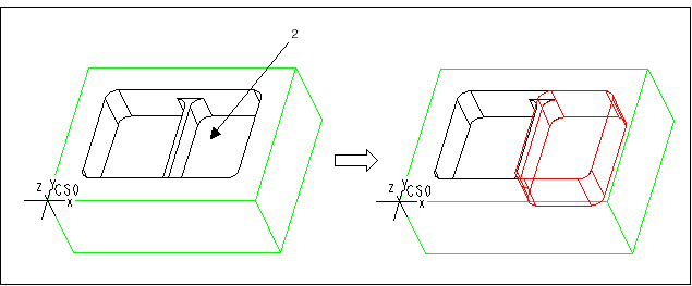 2. Create another Pocket feature and select the bottom of the cavity (2) on the other side of the rib as the Floor surface. The system creates the second Pocket feature.