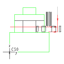 The next illustration shows the side view of the model after the first machining pass, when the Side Mill tool starts machining the Floor of the Undercut.