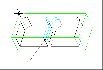 The Rib Top feature in this example has an open configuration; that is, it has only one Hard Wall. To machine this Rib Top feature, select the wall opposite the Hard Wall (surface 1 in the following illustration) as the Rib Start Wall.