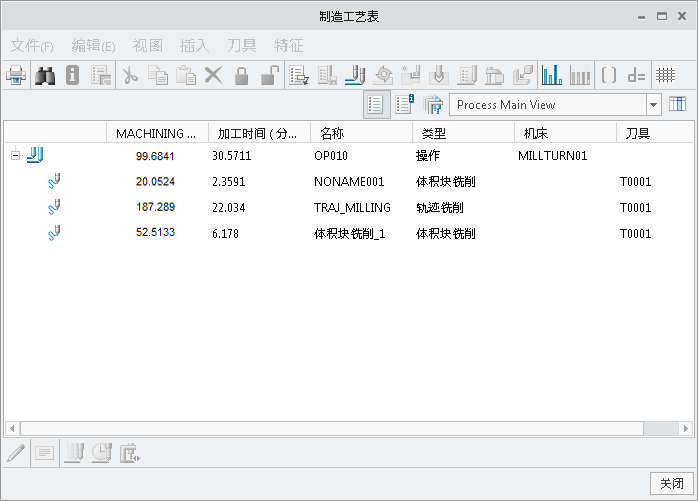 使用视图构建器将全局参数 MACHINING_COST 添加到工艺表。Creo NC 将基于指定的关系计算每个步骤的加工成本,并在 MACHINING_COST 列显示计算结果。