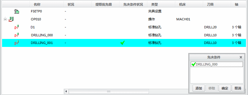在本例中,步骤 DRILLING_001 的先决条件被设置为步骤 DRILLING_000。如果工艺表中没有“先决条件状况”列,则必须用视图构建器将“先决条件状况”(Prerequisite Status) 列添加到工艺表。
