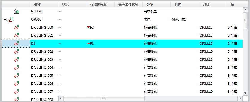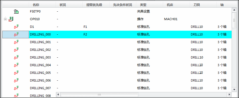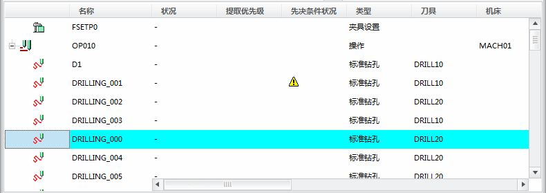 如果将步骤 DRILLING_000 移动到步骤 DRILLING_001 的下方,则先前设置的先决条件 (即 DRILLING_000 应始终在 DRILLING_001 之前) 将不再有效。所有此类违反先决条件规则的现象将通过“先决条件状况”(Prerequisite Status) 列中的警告符号来指示。