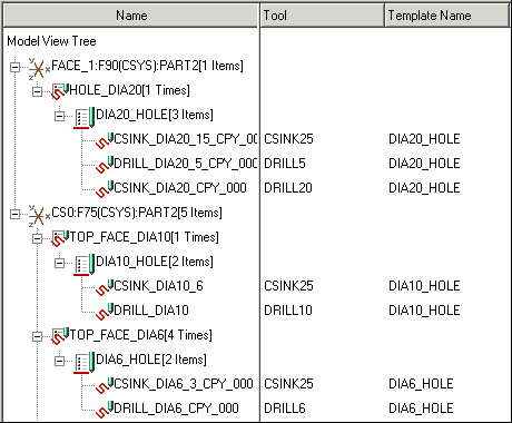 1. 在“制造模板注释元素提取”(Mfg Template AE extraction) 对话框中单击“模型视图”(Model View) 选项卡。模型视图以树的形式出现。步骤按 Z 轴方向、制造标准和制造模板分组,如下图所示。