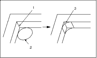 在此类型的“局部铣削”NC 序列中,系统通过沿拐角创建单一走刀或多条平行走刀刀具路径,清理选定曲面的边。可以使用跨距恒定的平行铣削走刀,对材料过多而无法通过单个“铅笔铣削”走刀移除的作业拐角进行清理。