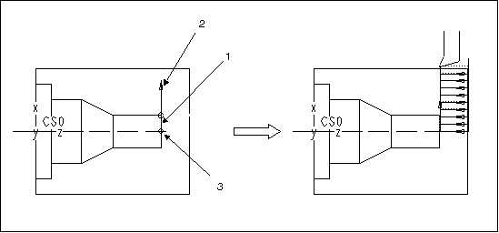 下图给出了在参考模型上区域车削表面的示例。在中心线 (表示车削轴) 上方定义“车削轮廓”(1)。按照如下方法指定