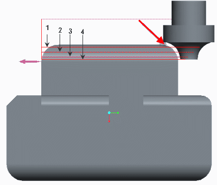 此刀具通过提供的偏移值先进行两次切削 (1 和 2),然后又进行最后两次切削 (3 和 4)。红色箭头表示倒圆角铣削刀具路径完成后所剩余的材料。
