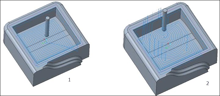对于值 1,无论“螺旋扫描方向”(SPIRAL_SCAN_DIRECTION) 选项设置为何值,刀具路径都自内侧开始并会沿着外侧边界。