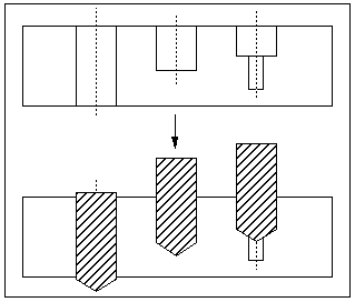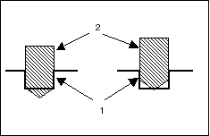 “刀具深度”选项按钮 (“通过肩部”(By Shoulder) 和“通过刀尖”(By Tip)) 可用于“盲孔”和“自动”钻孔,用于确定钻孔深度是否与刀具的肩部或刀尖相关。在下面的图例中,左侧的图片显示使用“通过肩部”(By Shoulder) 钻孔,右侧的图片显示使用“通过刀尖”(By Tip) 钻孔。在这两个图片中,图片 1 指出被钻孔的孔轮廓,图片 2 指出最终钻孔深度处的刀具的轮廓。