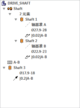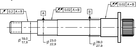 下图 (来自 ASME Y14.5-2009) 为自参考基准特征的示例。如图,基准特征 A 和 B 均受基准 A-B 的圆跳动约束。因此,此条件会调用特殊的工作流。请注意,由于这些特征为自参考特征,因此仅 GD&T Advisor 中的主要基准支持此类情况。