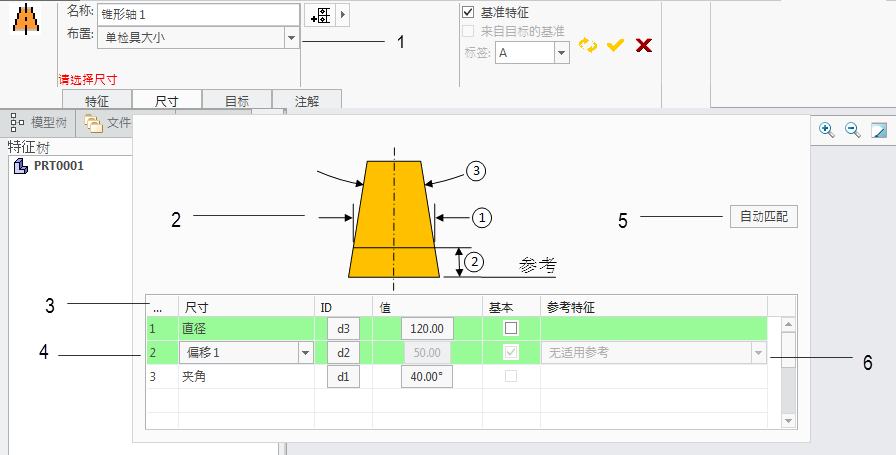 “参考特征”(Reference Feature):显示包含尺寸的候选参考特征的组合框 (如适用)。某些尺寸 (如偏移尺寸) 需要其他特征参考。组合框中包括的特征必须位于特征树中这一特征之前,且满足尺寸要求。如果组合框中包括多个特征,则应选择所需的尺寸参考。如果组合框中未列出任何特征,则无法找到候选特征。此时,应在操控板中取消操作并在添加此特征前先向模型中添加所需参考特征。