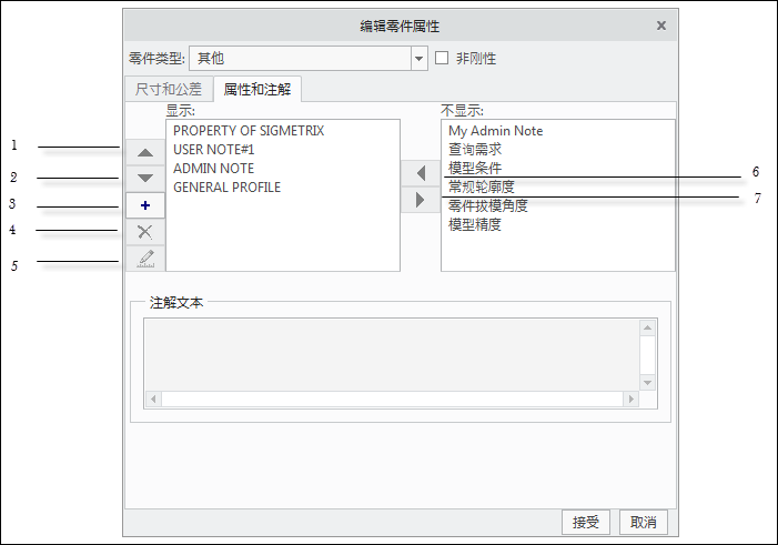“编辑零件属性”窗口中的此选项卡提供了用于管理模型常规注解的界面。有三个可用注解源: