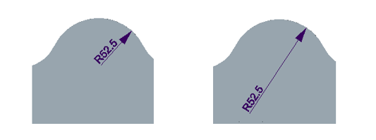 类似地,半径尺寸 (尺寸文本位于外侧) 的箭头显示如下: