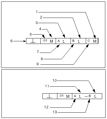 如果几何公差与基准关联,它在公差值后面的小格内放置参考基准名称。在可用处,它在参考基准字符后加上一个材料状态符号。
