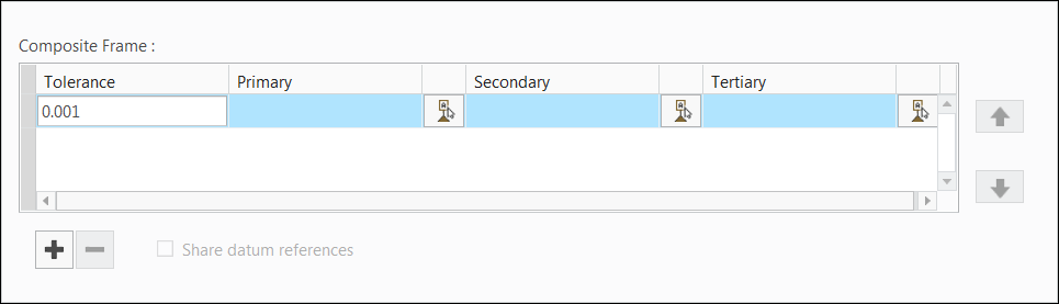 滑动面板为您提供“复合框架”(Composite Frame) 表,您可通过此表定义属于复合框架的公差和基准参考容器的内容。框架表包含以下四列:“公差”(Tolerance)、“主要”(Primary)、“次要”(Secondary) 和“第三”(Tertiary)。