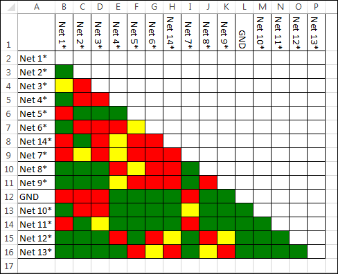 2. 在“目标网络”(Target Net) 下,可以查看相对于选定源而言所指定的距离值大于 0 的所有目标。所有目标均会显示漏电距离和间隙图标。这些图标指示了“源-目标”对之间的违规类型: