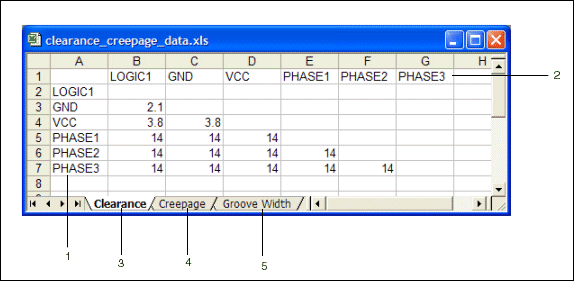 示例:Microsoft Excel 格式的间隙和漏电距离文件