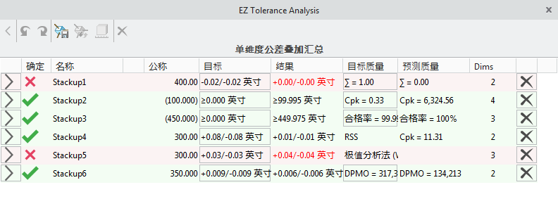 “单维度公差叠加汇总”(Summary of 1D Tolerance Stackups) 表格可列出所有叠加。
