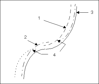 在下图中,处于同一零件中的分型曲线 1 和分型曲线 2 共享相同的分型曲面,但有不同的拖动方向。系统根据用户指定的最小半径 4 创建自动分型曲线 3。