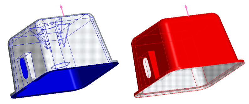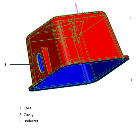 在以下示例中,模型的曲面被分类为型芯、型腔和底切曲面,并进行着色。