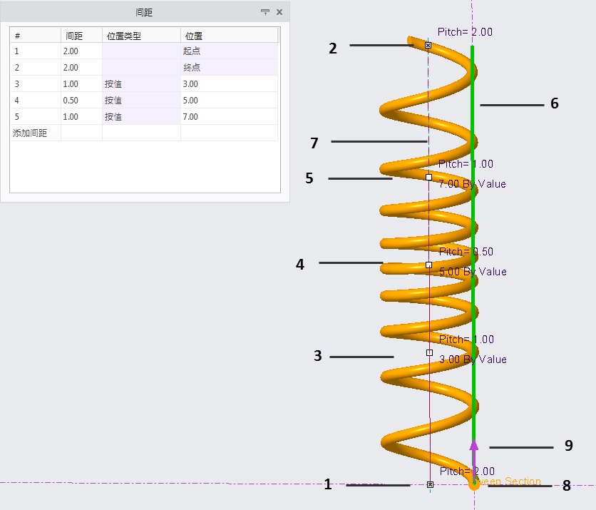 通过定义间距点来设置可变螺距。第一个螺距点始终从螺旋轮廓的起点投影到螺旋旋转轴,最后一个螺距点从螺旋轮廓的终点投影到螺旋旋转轴。