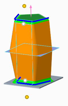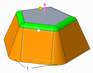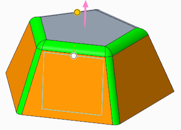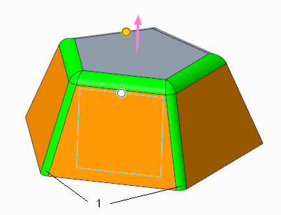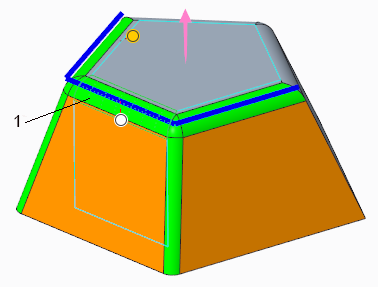 您可以选择其中一个连接倒圆角或倒角的曲面作为拔模枢轴。枢轴曲面必须与选择进行拔模的曲面相邻。系统将使用位于连接倒圆角或倒角底部的边作为种子,来生成定义枢轴的边链。沿边链方向的倒圆角或倒角的大小可以不同。