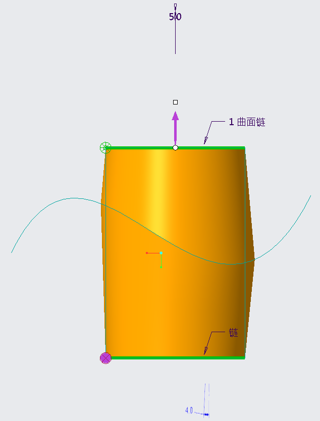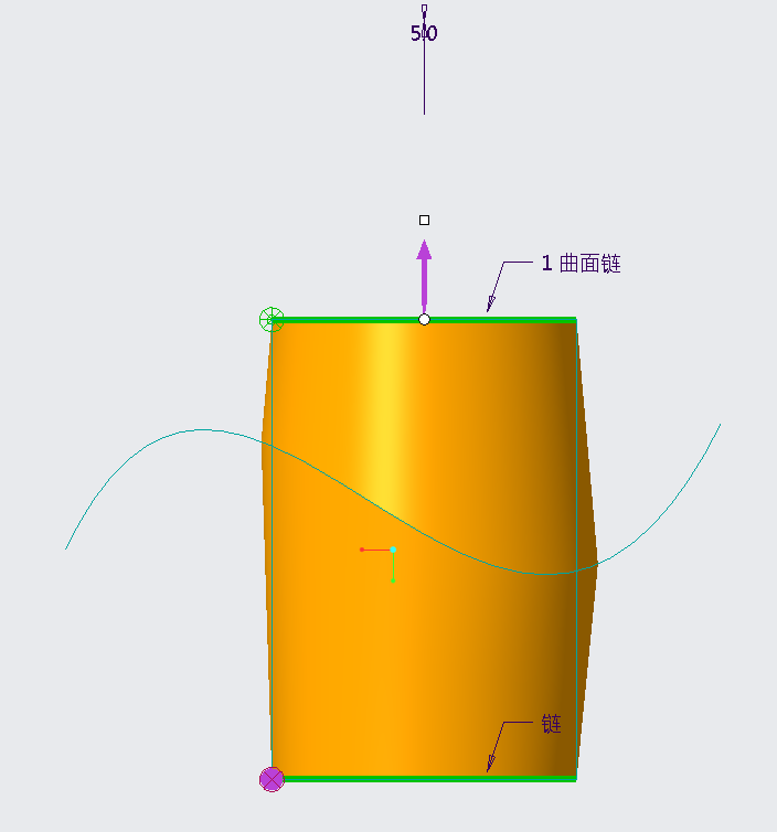 “拔模枢轴”(Draft hinges) 收集器,并选择圆柱的顶部边链。此链由两条边组成,对应于圆柱曲面的两半。要选择这些边作为链,先选择一条边,然后按住 SHIFT 键并再次选择同一条边,以指示要将其添加至链中,然后选择另一条边。