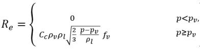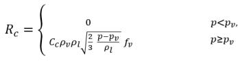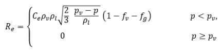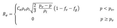 其中 Vrel 是液汽相对速度的模。在气泡流状态下 (即发生空化的情况下),Vrel 通常较小,大约为液相速度的 5-10%。通过使用各种极限自变量,例如 RB→0 即表示 αv→0,以及基于每单位体积的相变速率应与供体相的体积分数 (或质量分数) 成正比这一事实,获得下列蒸汽产生/冷凝速率表达式以完成空化模型: