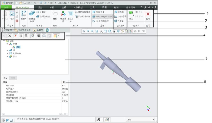 打开装配文件时,将显示 Flow Analysis 选项卡。Flow Analysis 选项卡中包含用于执行仿真的 Flow Analysis 选项。选项划分为下列组: