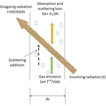 当辐射光线以特定方向穿透吸收、发射和散射介质层时,光线会在与其背离的方向上发生吸收和散射现象而损失能量。光线还会在朝向其的方向上发生发射和散射现象而从介质中的光源获得能量。如果光线在无限介质层上的总能量平衡,即会得到一个微分方程,称为辐射传输方程 (RTE)。
