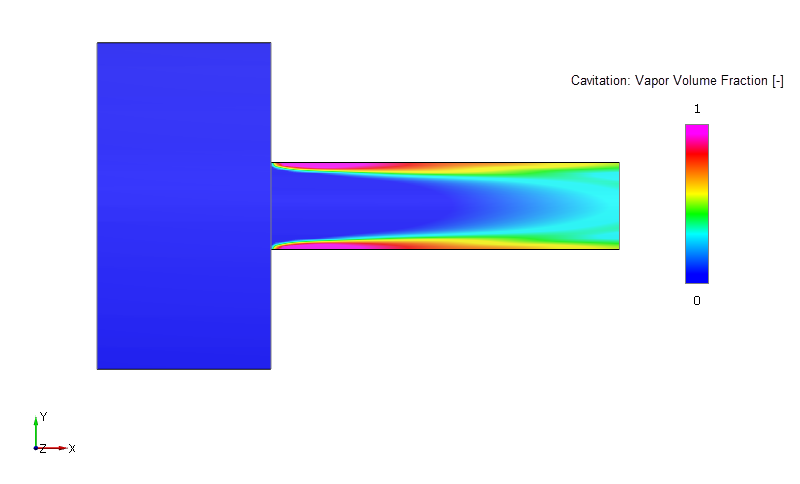 密度 = 1000 kg/m3 黏度 = 0.001 Pa-s 饱和度压力 = 3540 Pa | 入口圆柱 半径 = 1.15 cm 长度 = 1.6 cm 出口圆柱 半径 = 0.4 cm 长度 = 3.2 cm | 入口压力 = 250 kPa 出口压力 = 95 kPa |