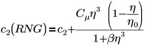 重整化群 (RNG) K-Epsilon 模型为可在 Creo Flow Analysis 中使用的“湍流”(Turbulence) 模型。该模型与标准 K-Epsilon 模型相似,但是其表达式包含两个新常量,用于修正以下方程中的 C2 RNG 项: