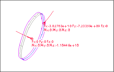 下图显示在 Creo Simulate 中打开的凸轮零件。在导入 Mechanism Dynamics 载荷后,系统会创建两个基准点以应用载荷。凸轮载荷的基准点将于选定时间在两个凸轮之间的接触点位置创建。伺服电动机的基准点则在伺服电动机的零点位置创建。导入载荷后,零件上将显示指示导入载荷方向和模的图标。