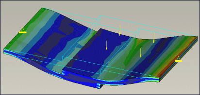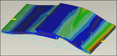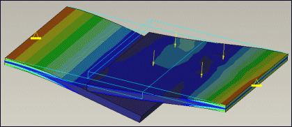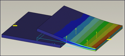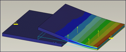 连接 (Bonded) – 下图显示了两个使用连接界面连接的板。分析过程中它们始终彼此接触。施加的载荷将板向下推或向上拉时,它们彼此不分离。由于施加的力在两个连接曲面之间转移,所以两个板显示相同的应力条纹。