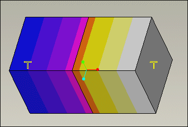 以下模型包含使用 Creo Simulate 热模块中的热阻界面进行连接的两个块。对右侧的块施加 10 华氏度的规定温度,对左侧的块施加 0 华氏度的规定温度。两个块之间会进行热传递。两个块都显示了温度条纹。温度从右至左逐渐降低。