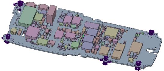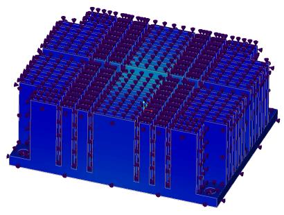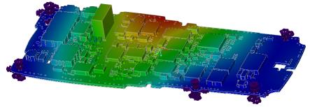 FR4 杨氏模量 E = 1.1e10 帕 密度 ⍴ = 1900 kg/m3 泊松比 ν = 0.28 环氧树脂 杨氏模量 E = 1.1e9 帕 密度 ⍴ = 950 kg/m3 泊松比 ν = 0.42 | 如下图所示,固定支撑靠五个支撑孔支持。 |