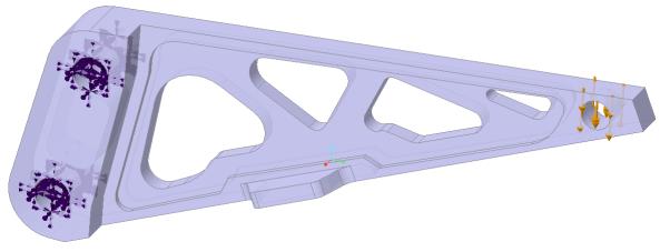杨氏模量 E = 7.1e10 帕 密度 ⍴ = 1900 kg/m3 泊松比 ν = 0.33 | 两个固定支撑,如上图所示 | 200N,如上图中所示。 |